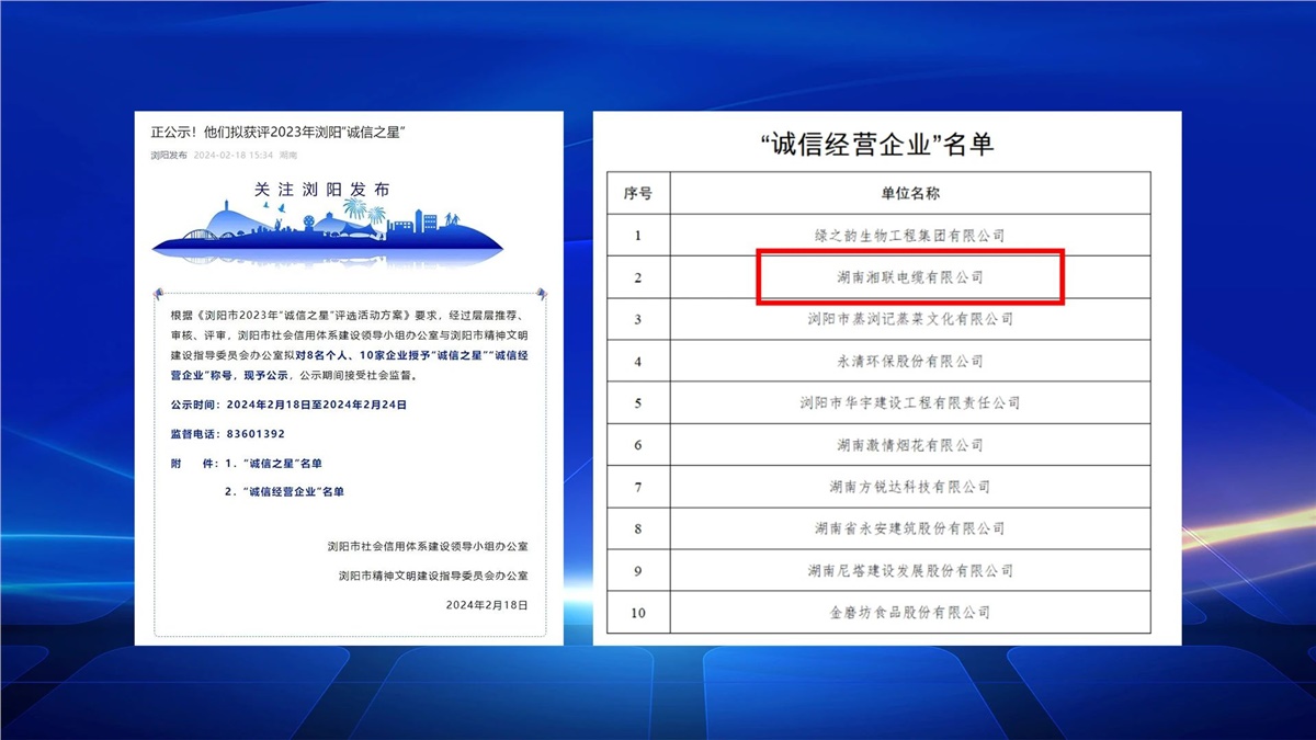 2月,瀏陽市社會信用體系建設與瀏陽市精神文明建設指導委員會辦公室聯(lián)合開展的瀏陽市2023年“誠信之星”評選進行公示,湖南湘聯(lián)電纜有限公司成功入選,成為2023年“誠信之星”。
