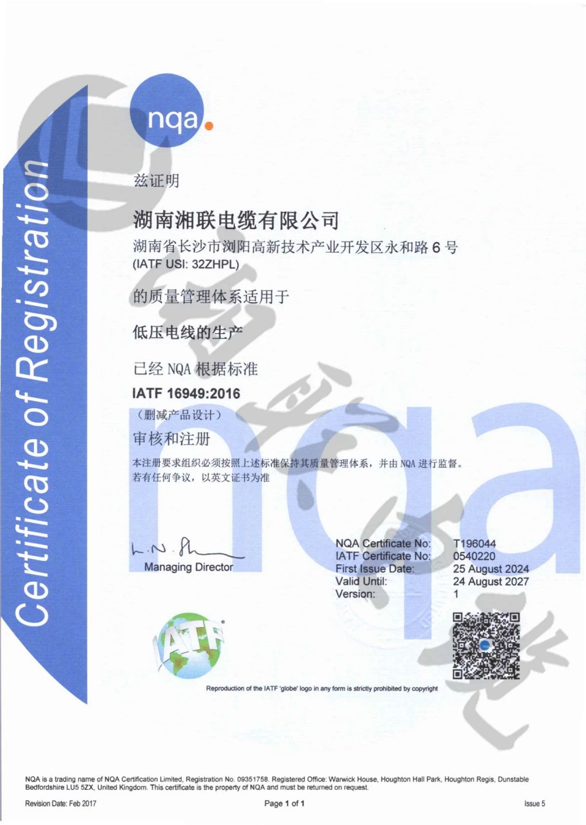 9月,湘聯(lián)電纜成功獲得了IATF16949:2016質量管理體系認證。IATF 16949:2016標準是專為汽車行業(yè)設計的質量管理體系標準,此項認證標志著湘聯(lián)電纜在質量管理體系、產品品質等方面均已滿足汽車行業(yè)的高質量管理標準。