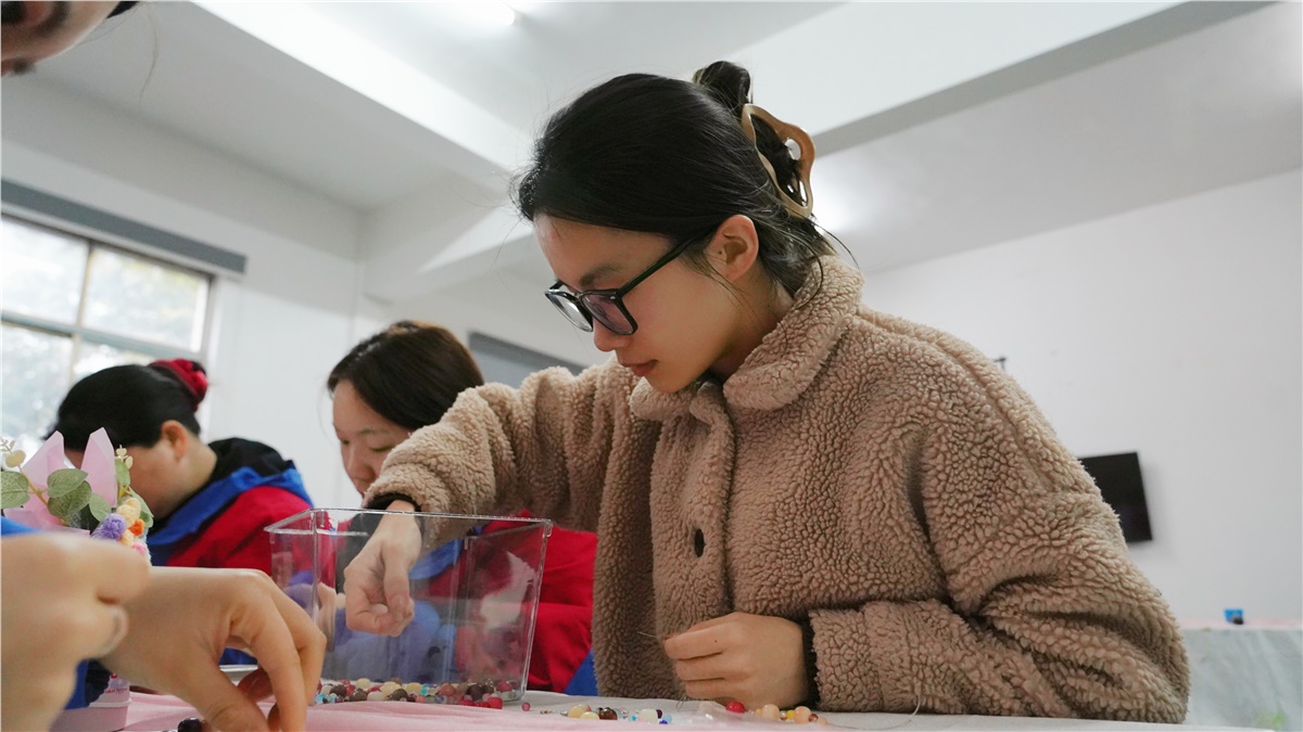 活動現場歡聲笑語不斷,大家互相交流、互相幫助,一顆顆散落的珠子,在巧手的穿引下,變成了一條條獨具匠心的手串,大家愉快地展示著自己的創作成果。